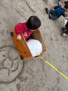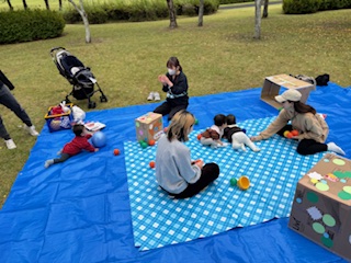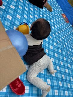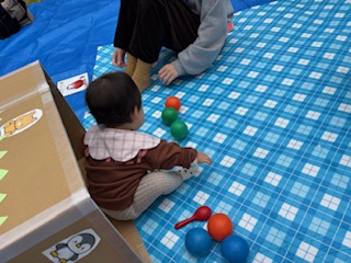 いろんなところを歩いたり登ったりするお子さんや、砂遊び初めて~というお子さんもいました。まだ歩かないお子さんは、芝の上に敷いたシートの上でボール遊びや絵本、つかまり立ちをするなどして、とても楽しそうでした。スタッフ手作りのダンボール車やトンネルも喜んでくれましたよ!
