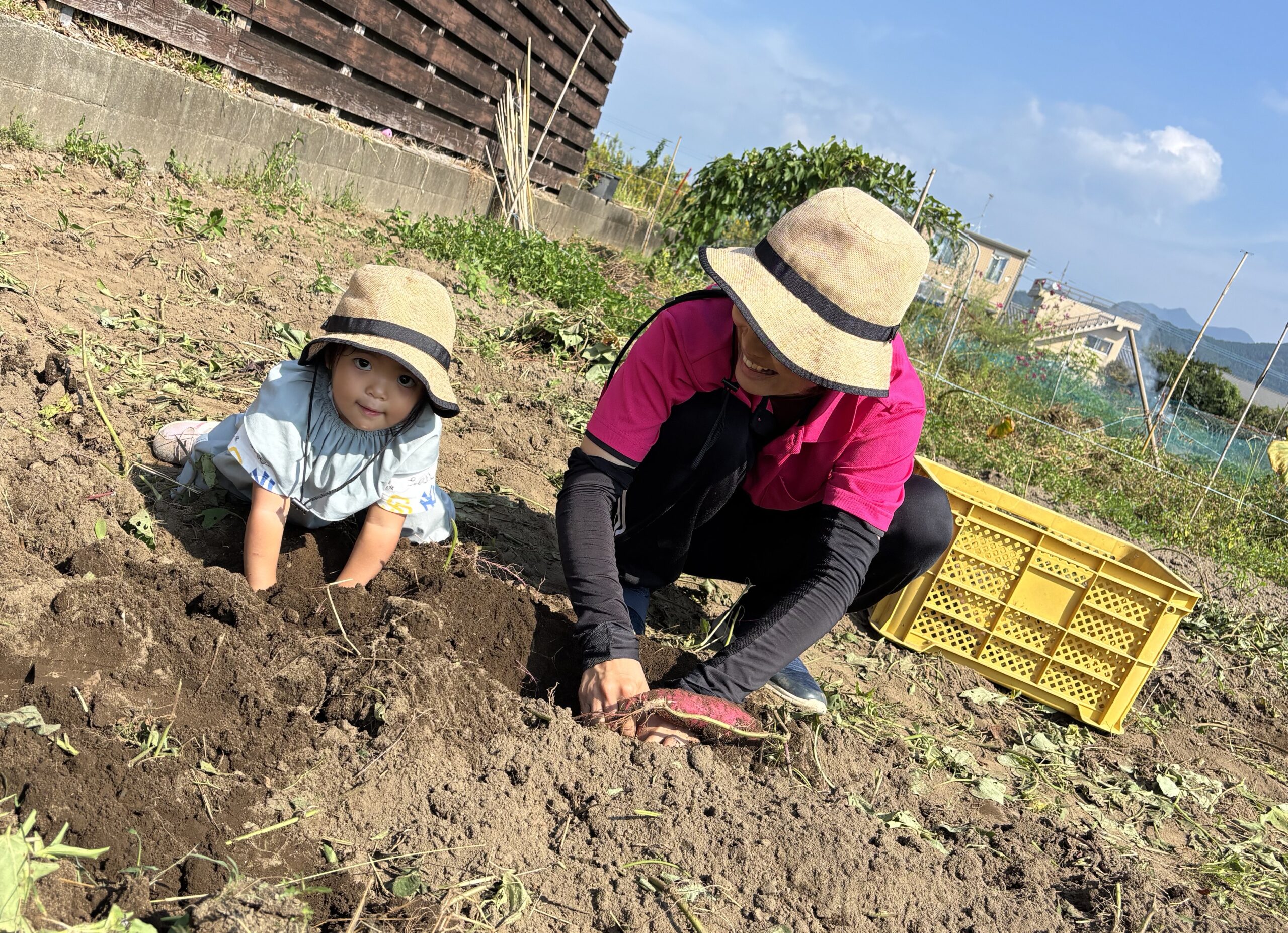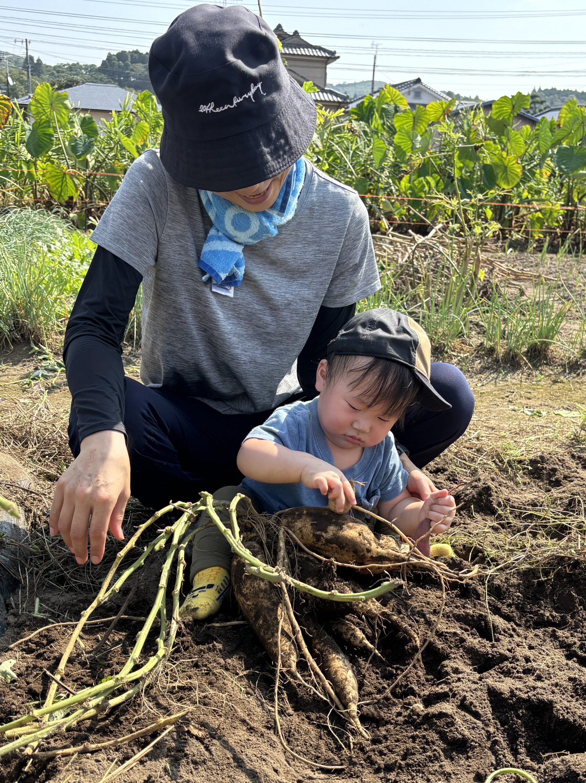 先日、こみなとさん家では、川畑ひろば企画「おいもほり」でした。夏のように暑い日で、みなさん汗びっしょりになりながら、おいもほりをがんばりました。大きな大きなおいもさんが土の中から出てくると、「見て見て~、大きい!」と声が上がりました。初めての体験の小さいお子さんたちも、思い思いに土と遊んだり、おいもにさわったりして楽しんでいました。
