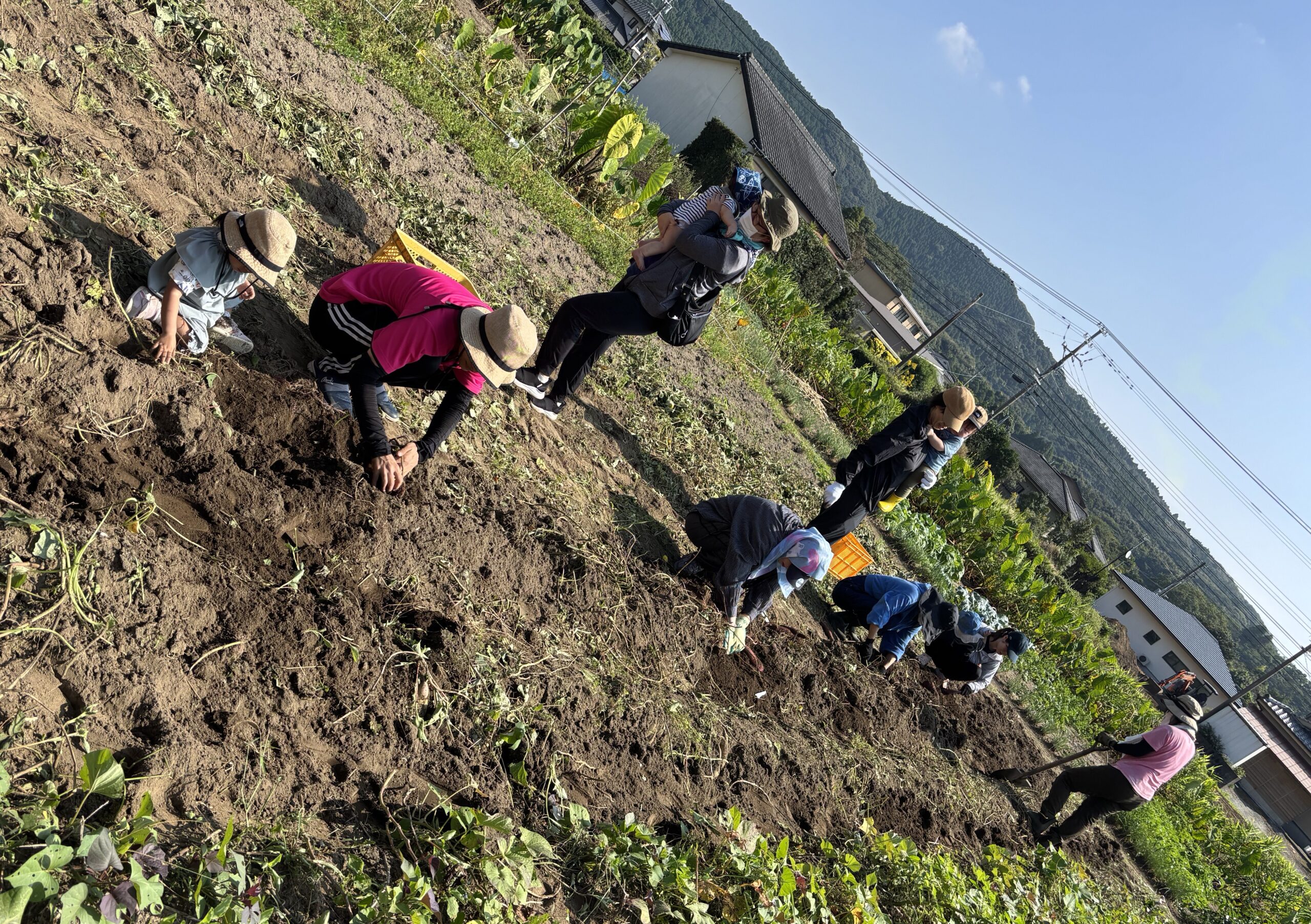 先日、こみなとさん家では、川畑ひろば企画「おいもほり」でした。夏のように暑い日で、みなさん汗びっしょりになりながら、おいもほりをがんばりました。大きな大きなおいもさんが土の中から出てくると、「見て見て~、大きい!」と声が上がりました。初めての体験の小さいお子さんたちも、思い思いに土と遊んだり、おいもにさわったりして楽しんでいました。